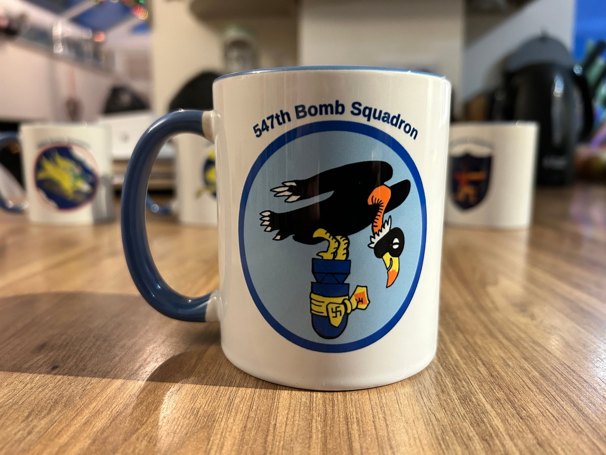 Dishwasher and microwave proof mug - white outer, blue inner carrying the squadron crest of the 547th Bomb Squadron.