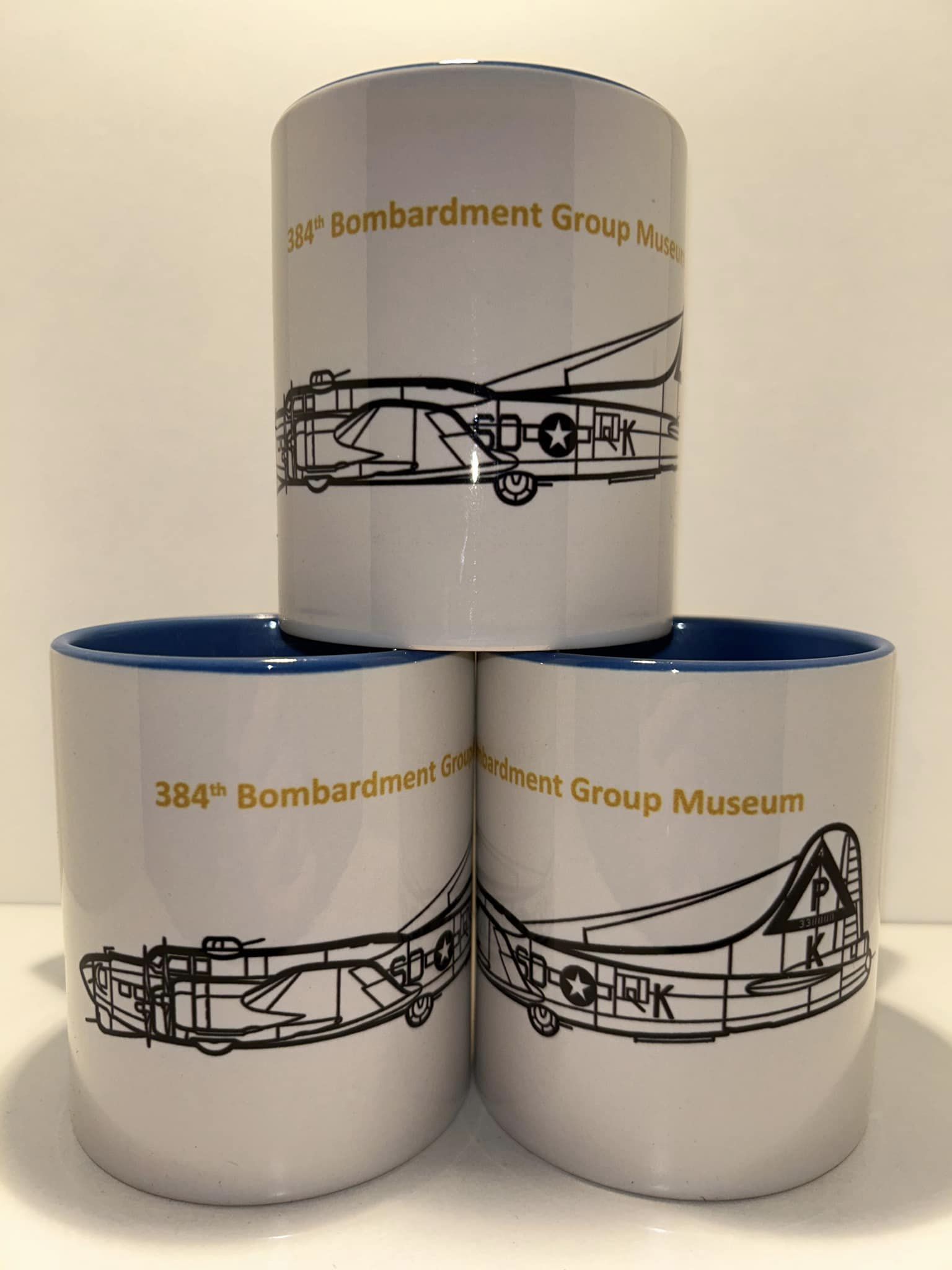 Dishwasher and microwave proof mug - white outer, blue inner with wraparound image of the 384th's B-17G "Busy Buzzard".